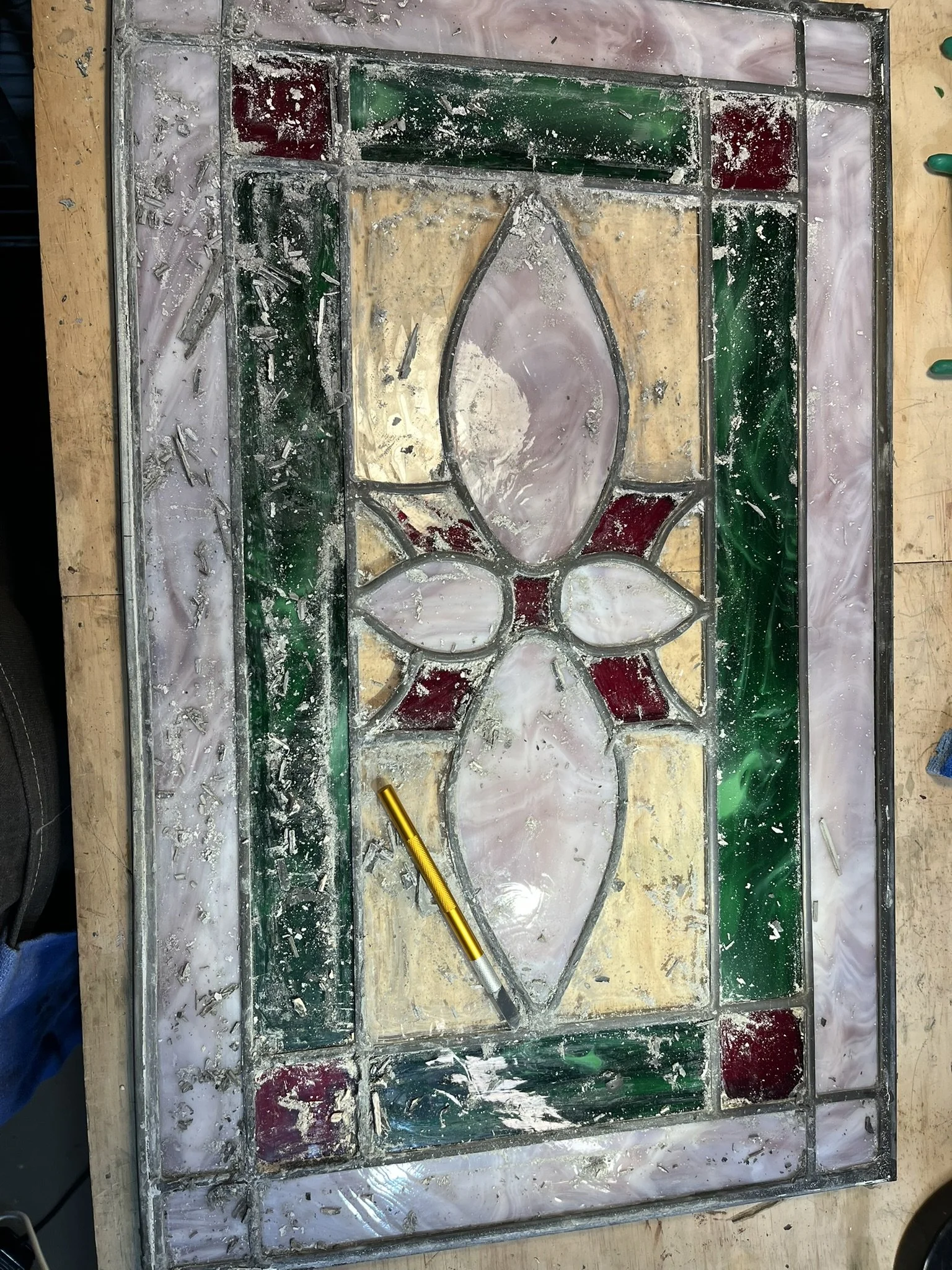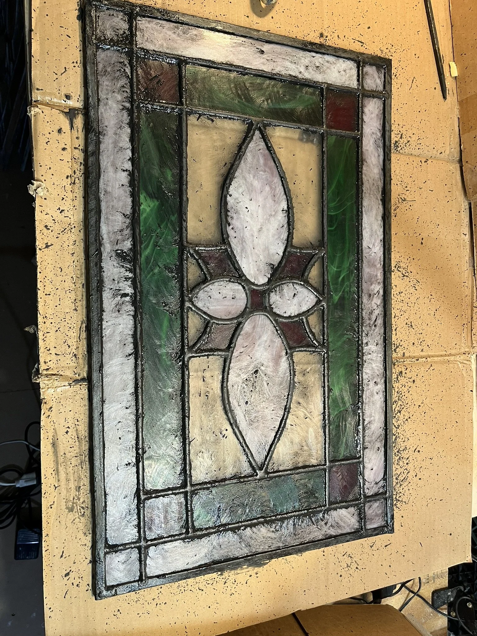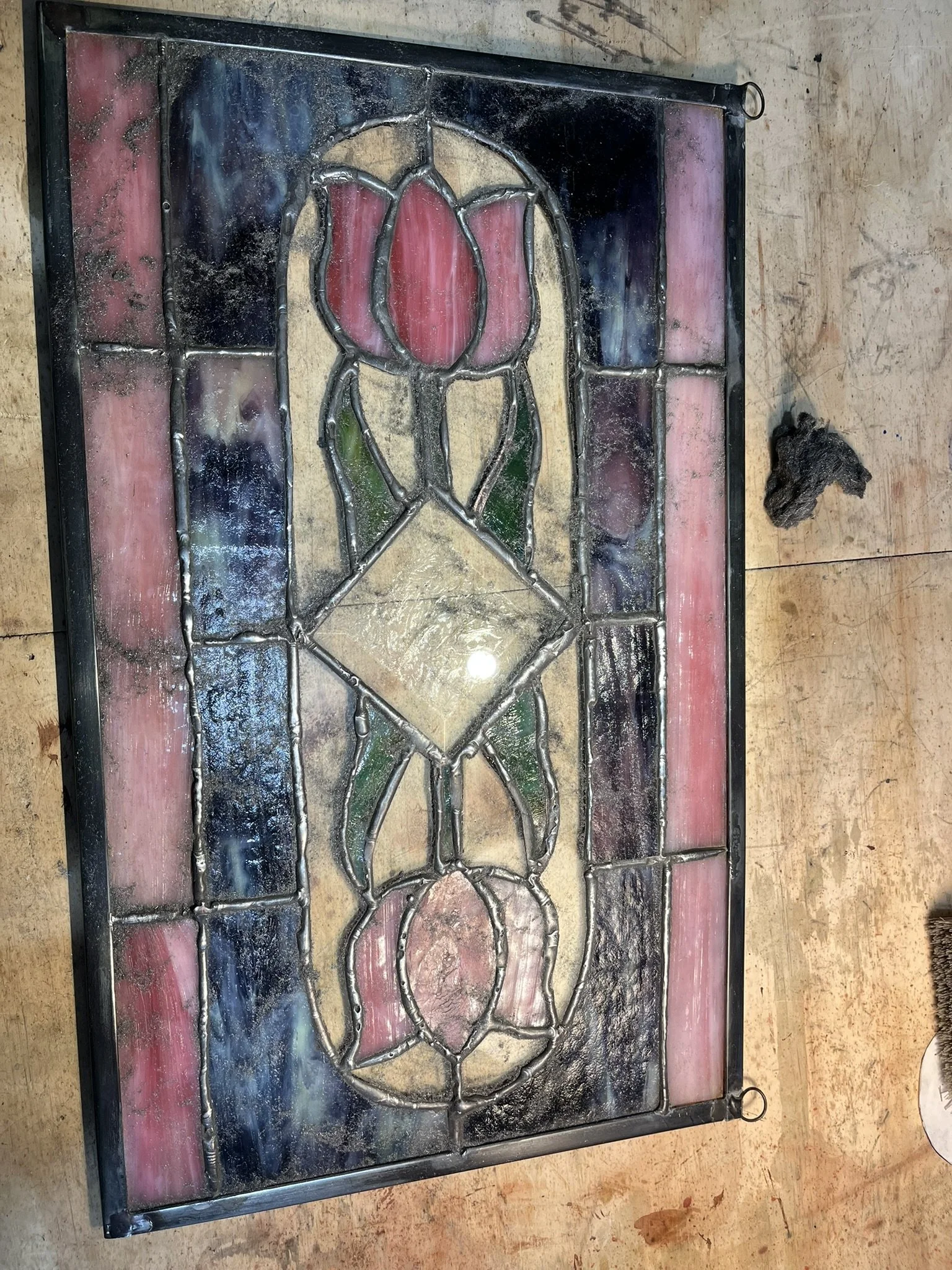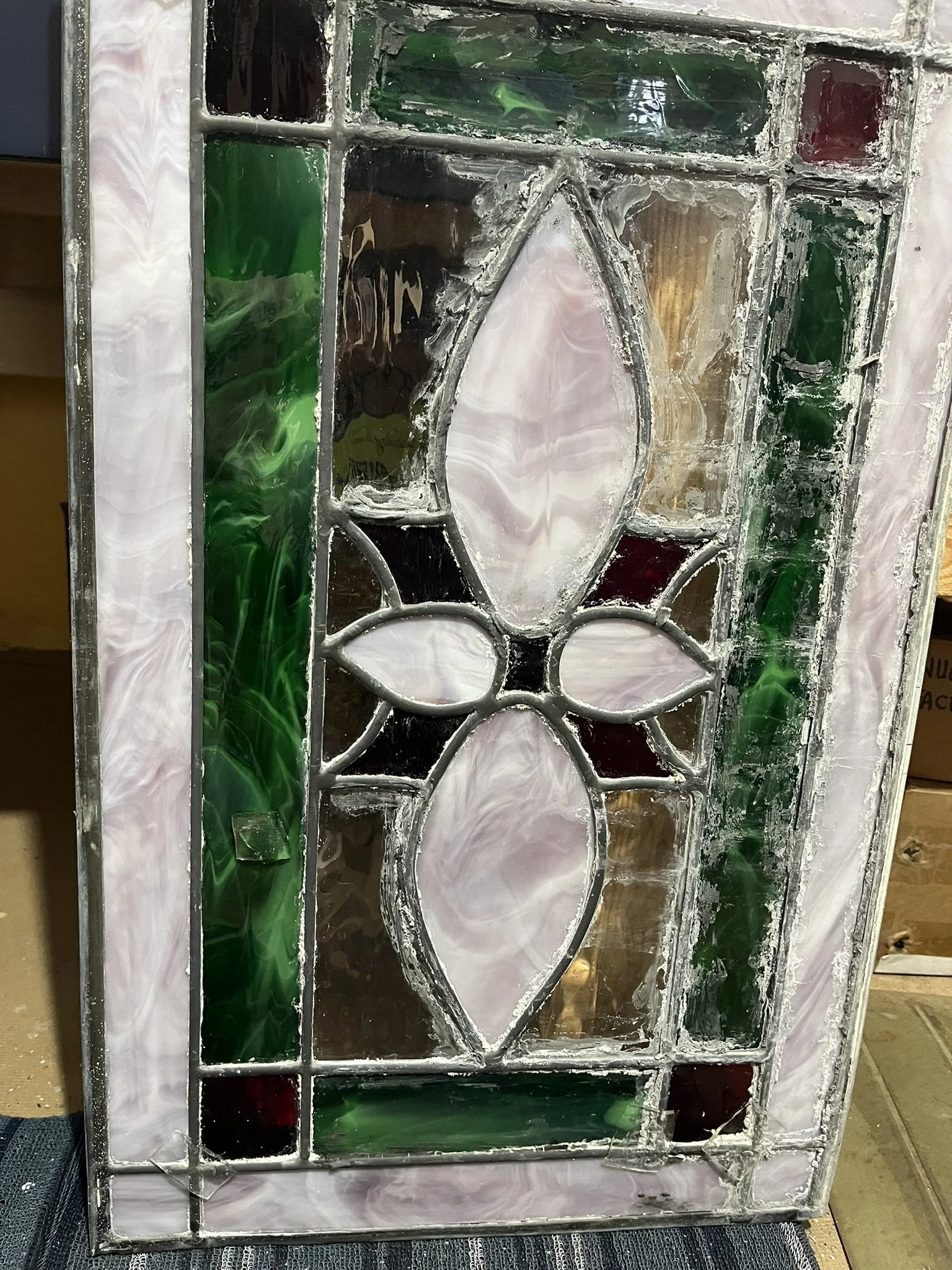 This client was having the window sashes of her bunglaow repaired. The stianed glass transom windows were removed for the repair and I was able to clean up all the corroSIOn, replace broken glass, re-cement all panels to return these antique windows back to their origINAL glory.