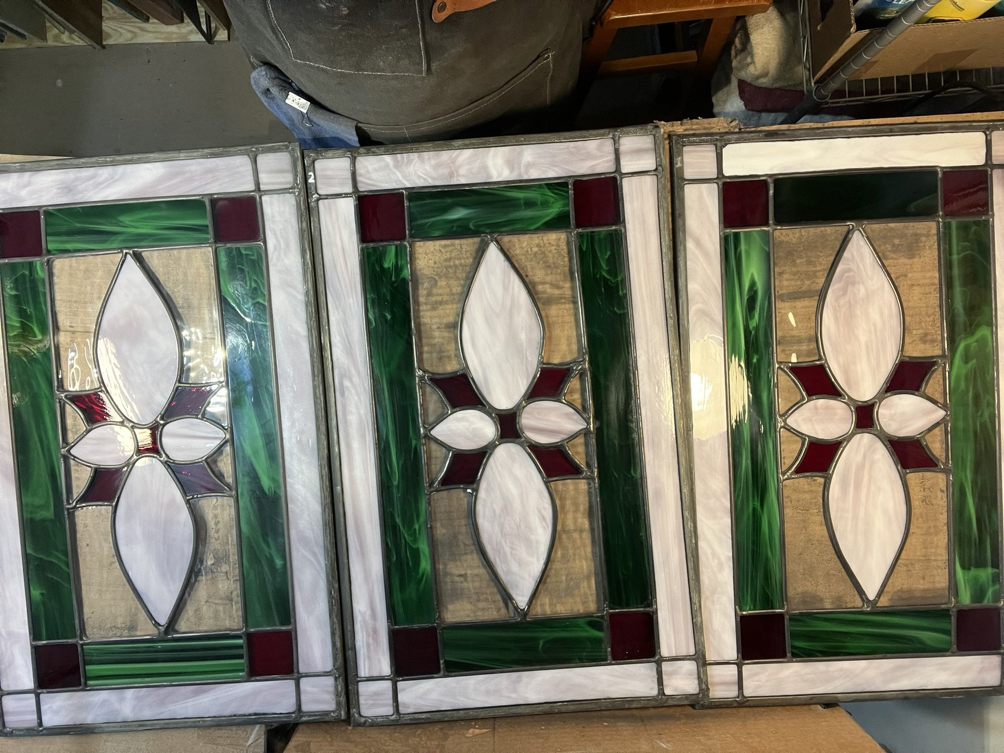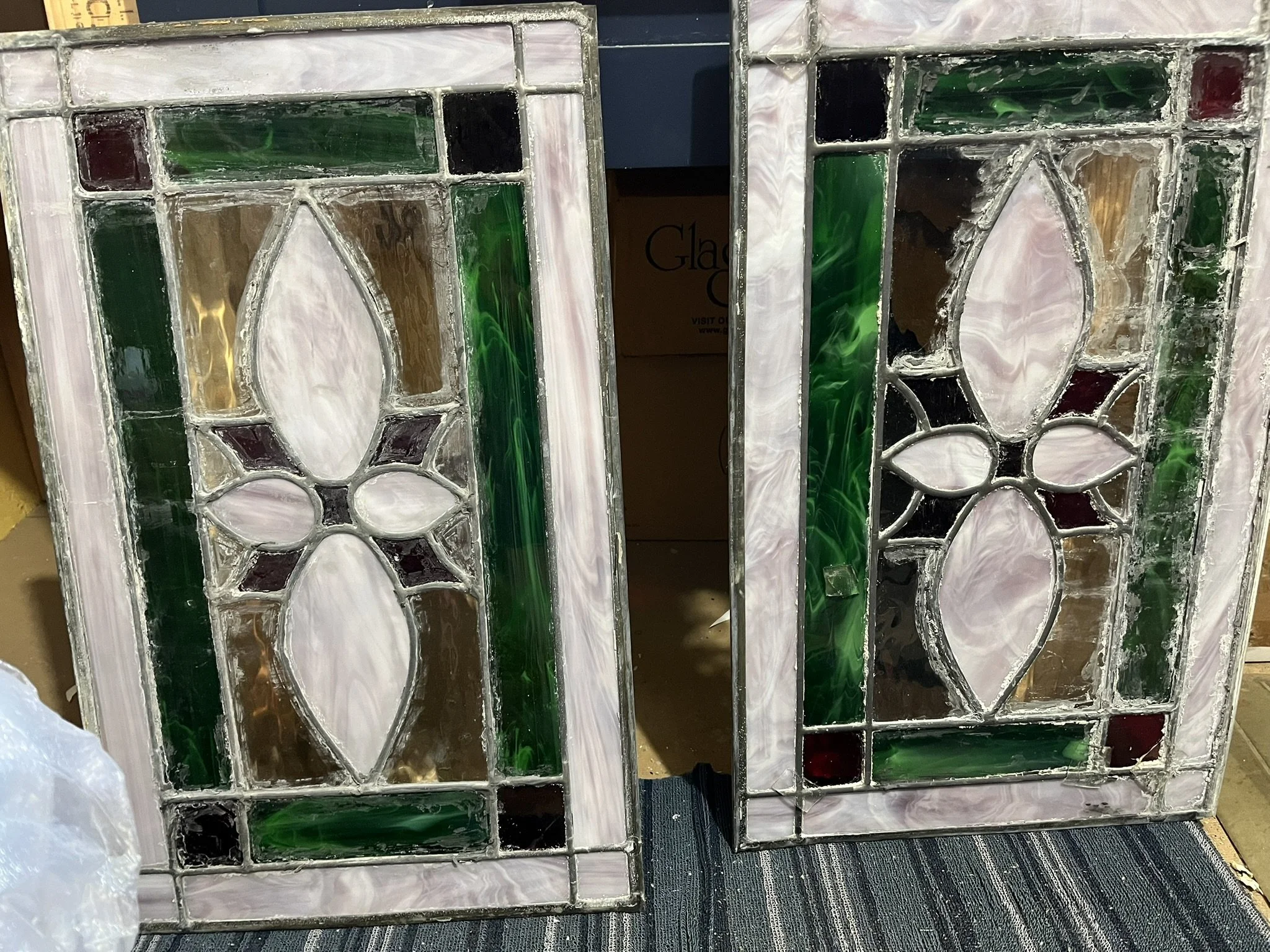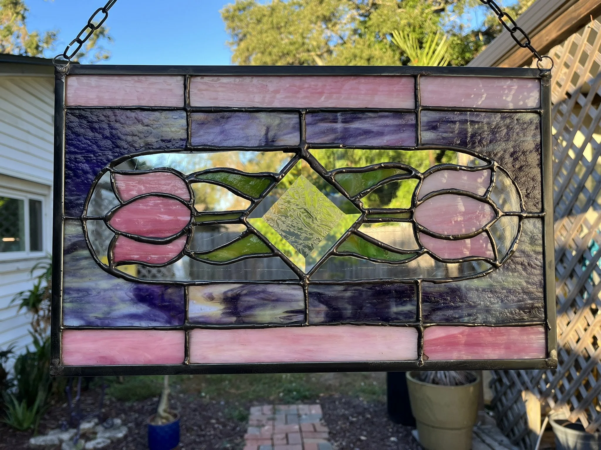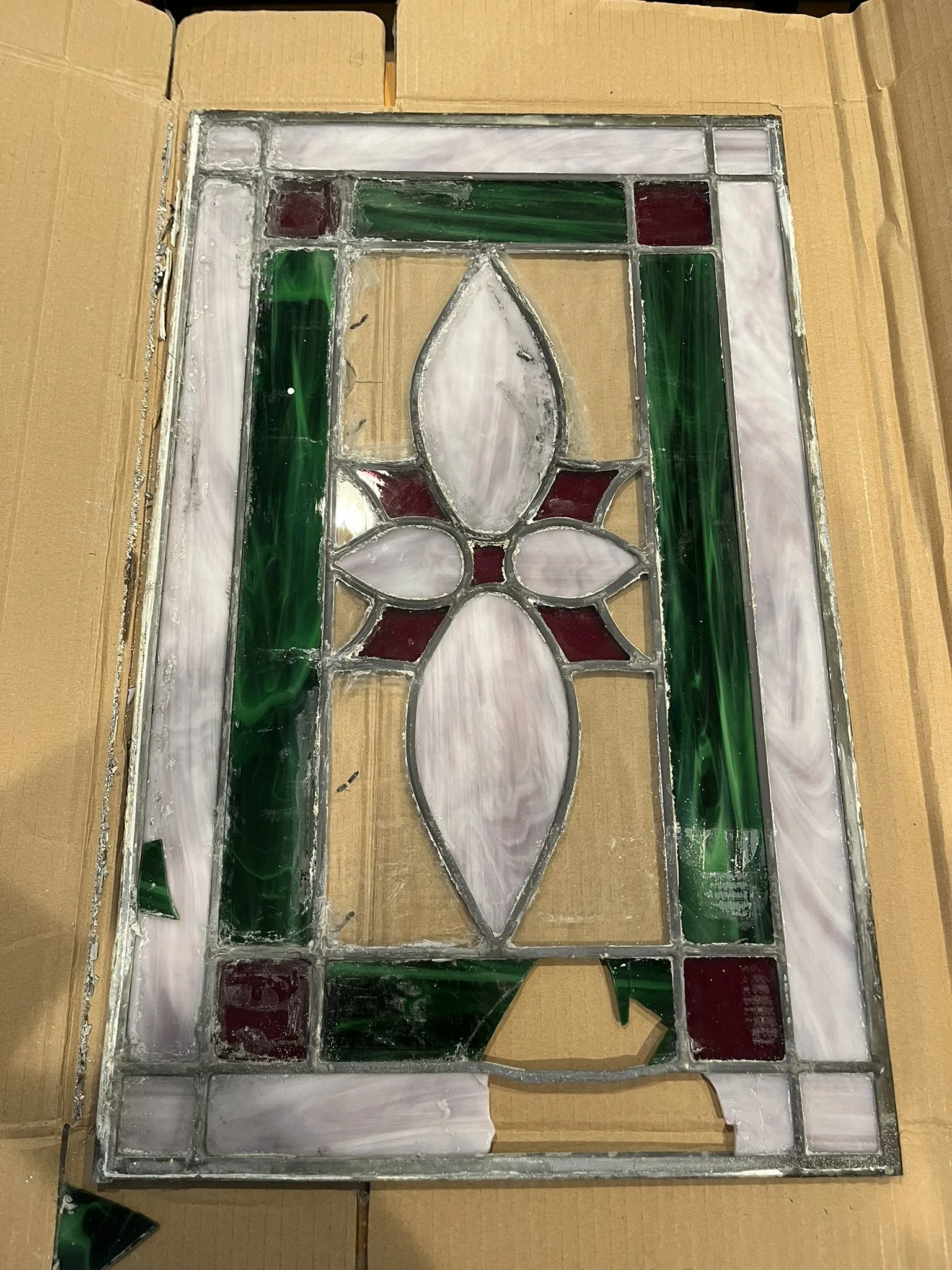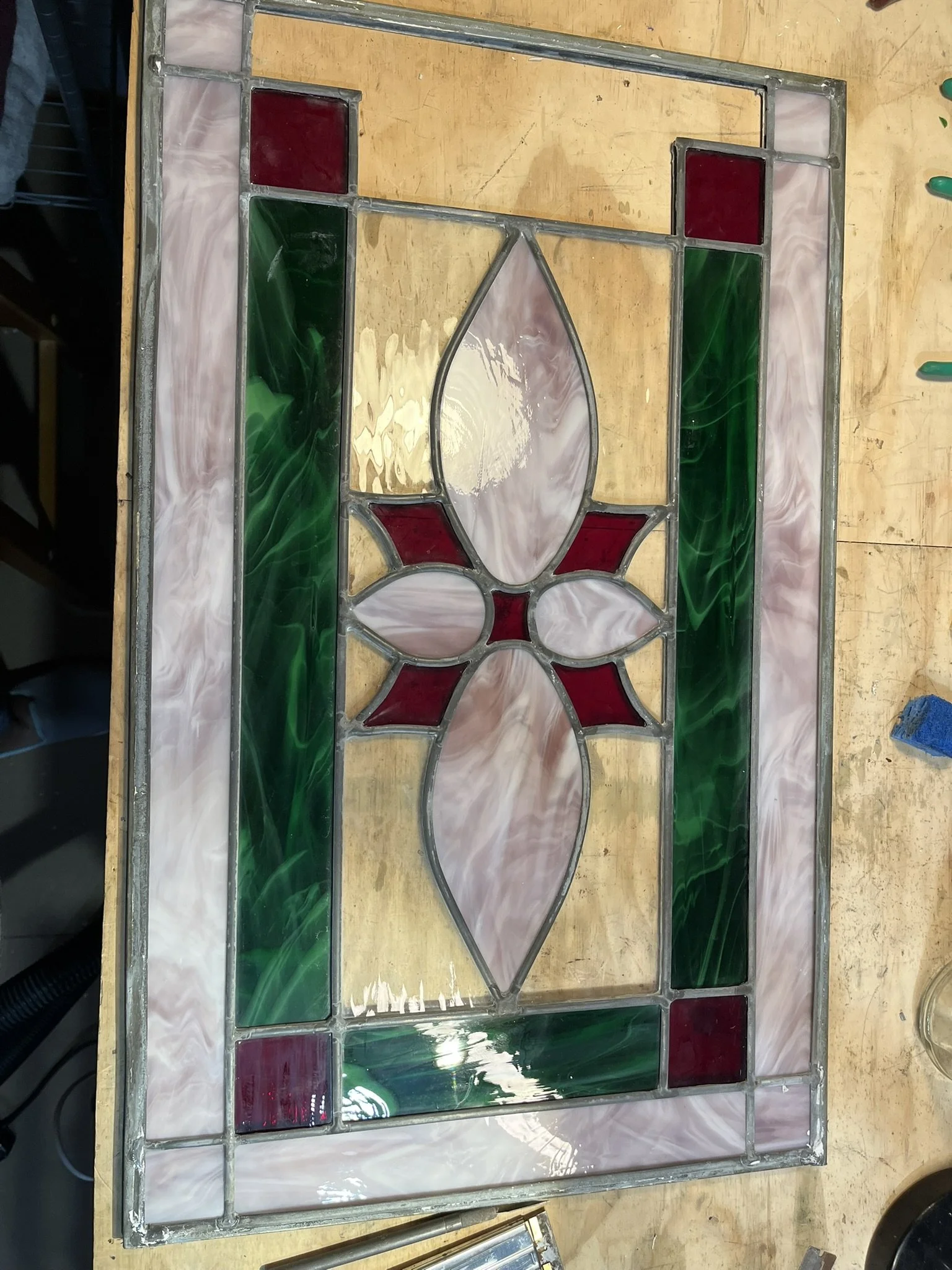 This client was having the window sashes of her bunglaow repaired. The stianed glass transom windows were removed for the repair and I was able to clean up all the corroSIOn, replace broken glass, re-cement all panels to return these antique windows back to their origINAL glory.