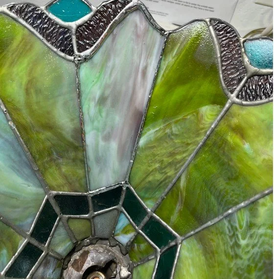This client had a piece that she was unhappy with. she asked me to replace a broken piece of glass and fix the bad soldering. this repair also required all of the old patina be removed so that new solder could be applied.